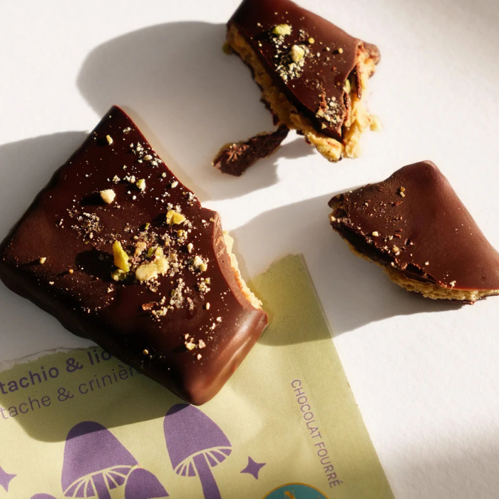 Diese preisgekrönten, quadratischen Pralinen aus dunkler Schokolade, gefüllt mit Pistazienbutter, knackige Pistazien und Extrakt des Wunderpilzes Löwenmähne enthalten durchschnittlich 80 % weniger Zucker als herkömmliche Schokoladentafeln. Dabei verwendet Cosmic Dealer nur eine Prise Datteln (2 g oder weniger pro Schokolade) für einen Hauch natürlicher Süße. Zudem sind nur hochwertige Bio-Zutaten auf der kurzen Zutatenlisten: natürliche Nusspürees, die mit Kräutern, Pflanzen, Blumen und Früchten angereichert und mit handwerklich hergestellter Schokolade überzogen sind.